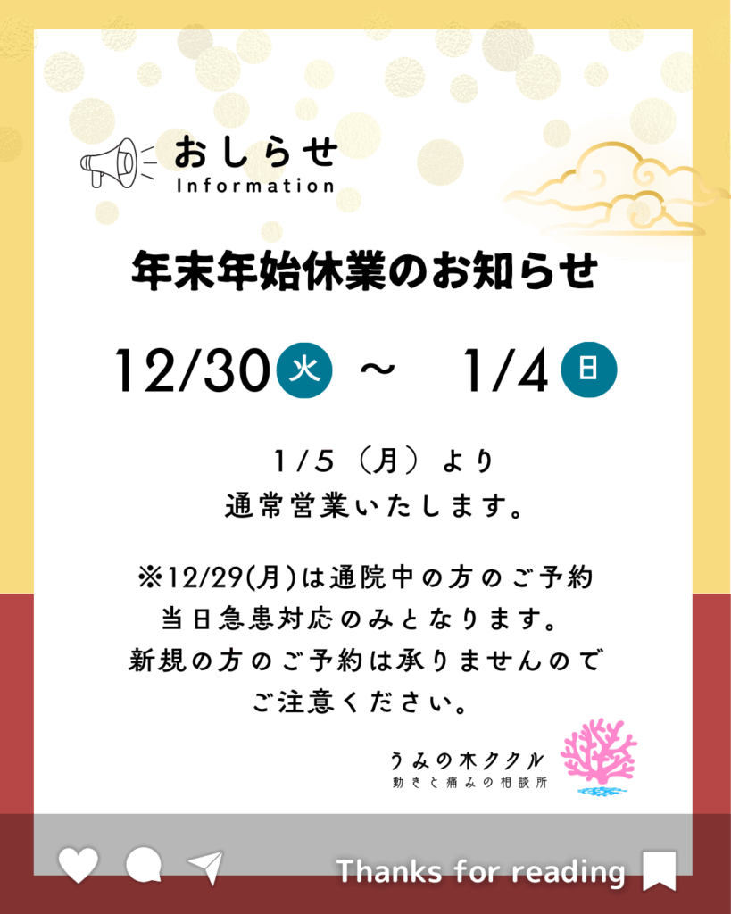 ※ケガ/急な痛みも当日対応可能。来院前にご連絡下さい。